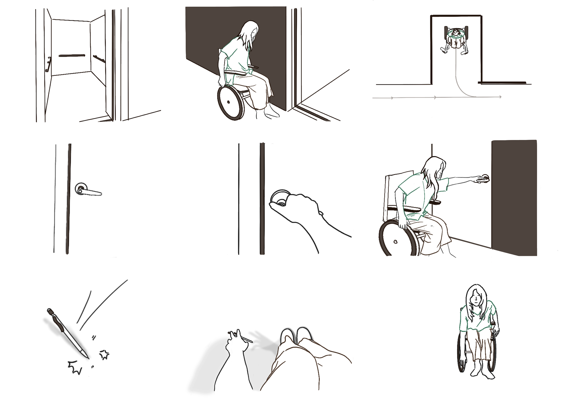 For my storyboard, I divided it into three tasks. The first two tasks depict wheelchair users struggling with daily activities that require reaching different levels while seated. The third task focuses on navigating tight spaces like elevators or restrooms, where wheelchair maneuverability is limited.