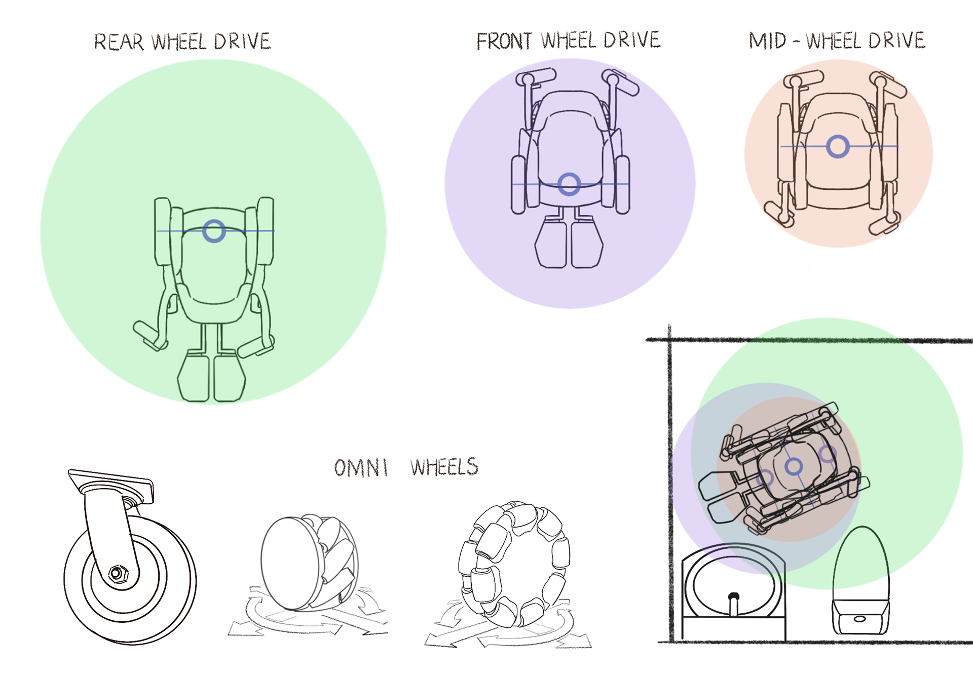 Additionally, I explored different types of wheels commonly used in wheelchairs, including caster wheels and Omni-directional wheels. Omni-directional wheels allow for turning in any direction without an extra turning radius, enhancing maneuverability when combined with mid-wheel drive.